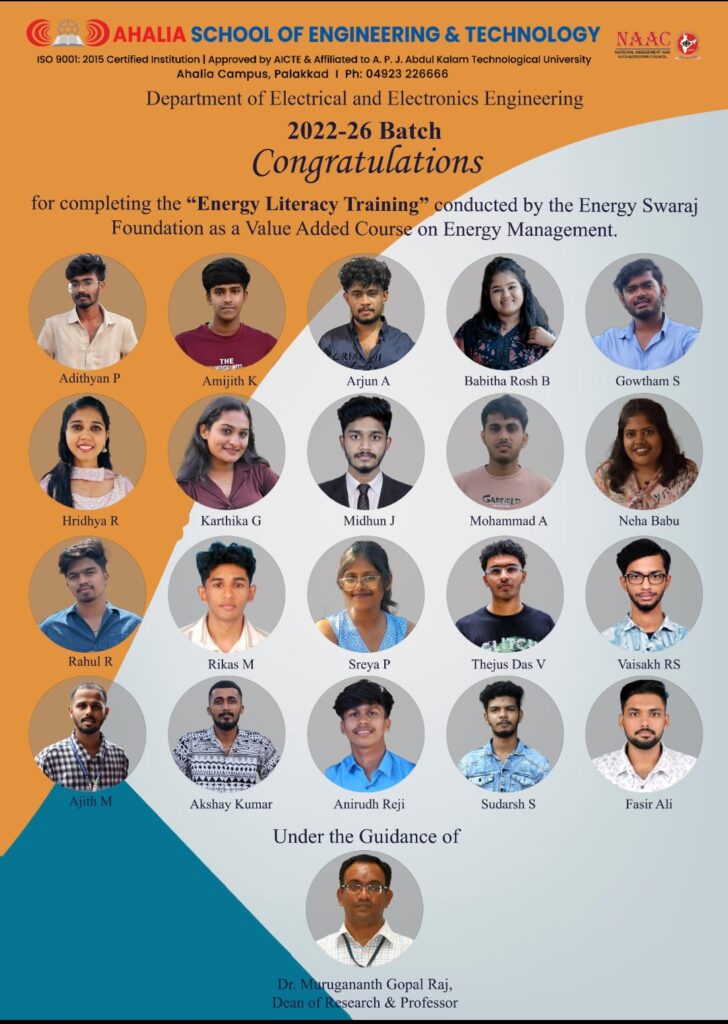 Congratulations to 2022 -2026 Batch Electrical and Electronics Engineering Department Students for completing the Energy Literacy Training conducted by Energy Swaraj Foundation as a Value Added Course on Energy Management under the guidance of Dr. Murugananth, Dean of Research and Professor