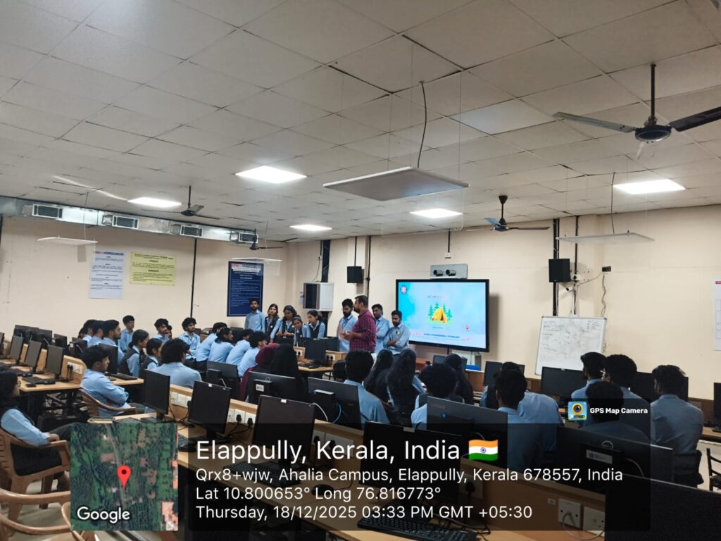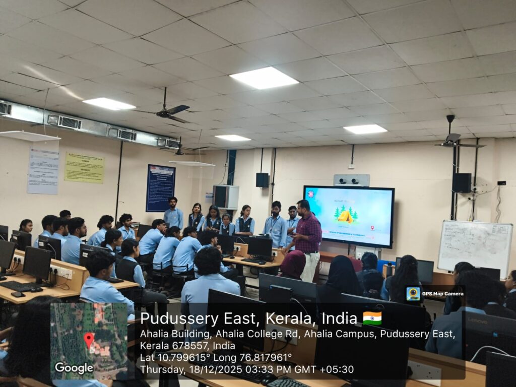 An NSS Camp Orientation session for the 2024–28 batch was conducted at Ahalia School of Engineering & Technology on 18 December 2025 at 3.20 PM in the D & A Lab. The session was handled by Mr. Jayakrishnan R, NSS Programme Officer, who briefed the students on the objectives, discipline, and significance of the upcoming NSS camp.